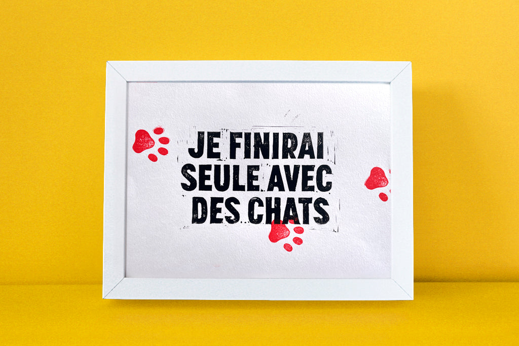 Après avoir réalisé mon illustration, je la grave à la main sur une plaque de linoléum. Cette plaque me sert ensuite de tampon : je lui applique une couche de peinture au rouleau, et viens presser le papier sur la plaque.